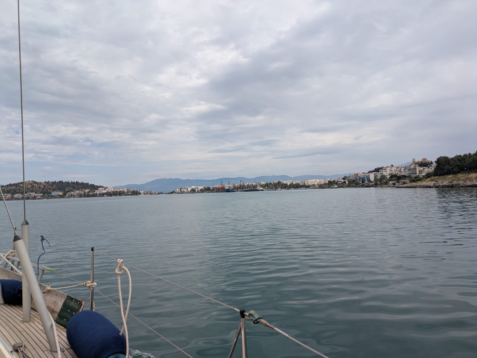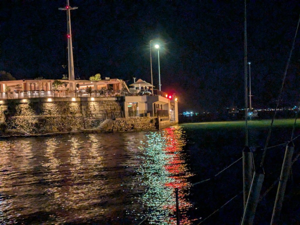 We motored the 12 miles from Eritrea, under a very large suspension bridge to a large enclosed lagoon with the Chalkida bridge at the northern end. The procedure is to either anchor near the bridge or tie up on the commercial dock wall, go and pay for the passage, and wait, listening on VHF channel 12 from 2130 for further instructions. Finding where to pay presented the biggest challenge, with visits to two port authority offices, an army barracks with armed soldiers all giving us the run around. We finally found the correct office, paid our €35, had a cold drink, returned to Jacana and waited. At about 2230 we (7 sailing boats in total) got the radio call to prepare to transit the bridge. It finally started retracting (it’s not a lifting bridge) at about 2300, and after letting a cargo vessel go first we made it through the bridge at about 2315. We then went on for about a mile and anchored in a large bay round the corner for the night.