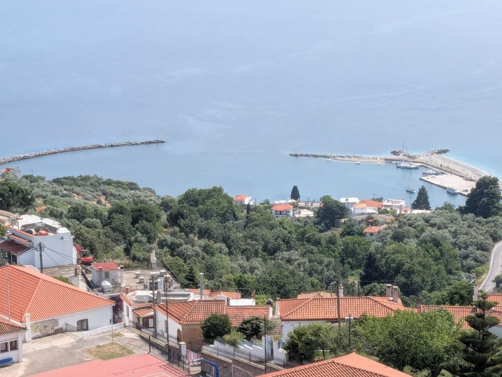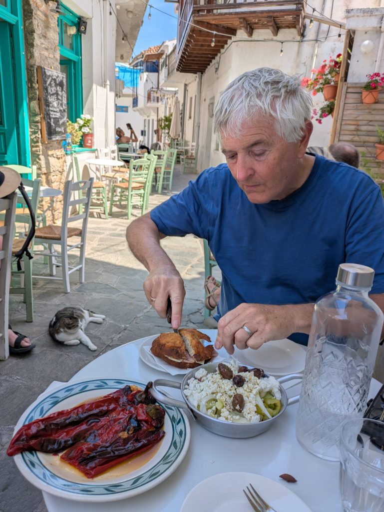 On arrival before lunch we headed upwards, up a steep path to the beautiful hillside village of Glossa. We stopped for a breather and a lady came out of her house and offered us a delicious glass of cold water. Arriving at the village we lost ourselves for a while exploring its narrow streets before enjoying lunch in one of the few tavernas, Rouja.