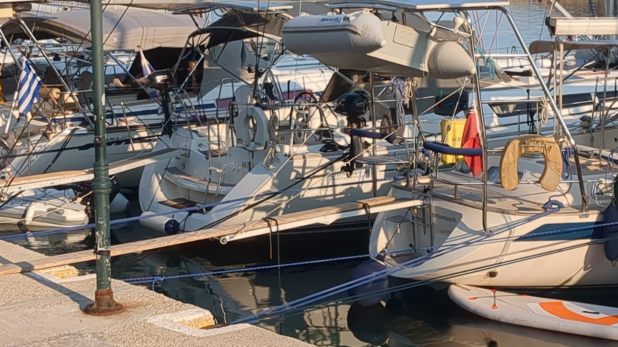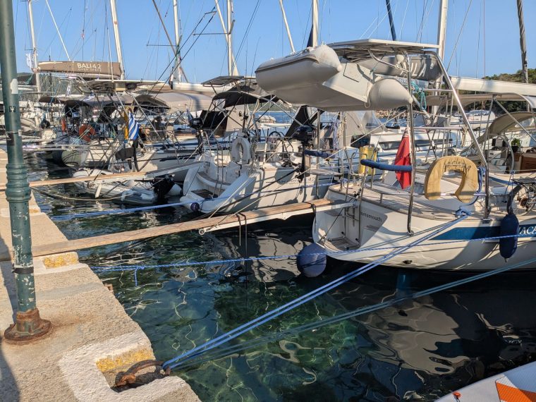 Another one night stop to the small and picturesque harbour of Steni Vala, just a few miles north west of Patitiri. Unfortunately, the harbour has large rocks in places against the wall but below the surface so we ended up probably 10 to 12 feet from dry land. Fortunately, a Taverna provides several very long planks to assist, it was very precarious getting ashore ! Late afternoon we had a short walk around the back of the tavernas to the beach.