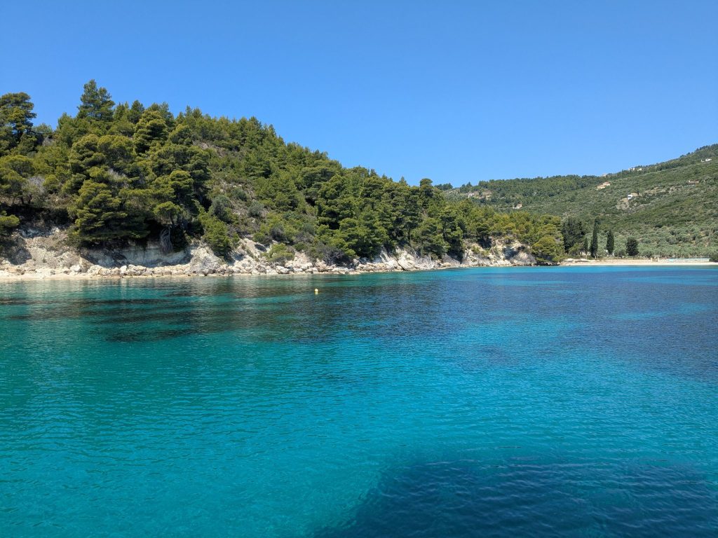 So an early (for us) departure at 0930, and a motor literally round the corner to anchor off Glyfa Beach for a couple of hours, where Ann went for her first, and still very cold dip of the year. Then a few miles back down the coast of Allonissos to the sheltered bay of Tzortzi Gizmos to anchor for the night. After a couple of hours, Roger and Cheryl appeared, and we caught up with them over a drink and evening meal at the beach taverna.